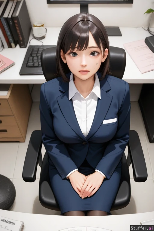 semi realistic wide angle older man surprised facial expression sitting in a office chair office room looking at viewer