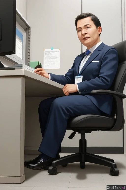 semi realistic wide angle older man surprised facial expression sitting in an office chair office room The perspective of someone walking into the room