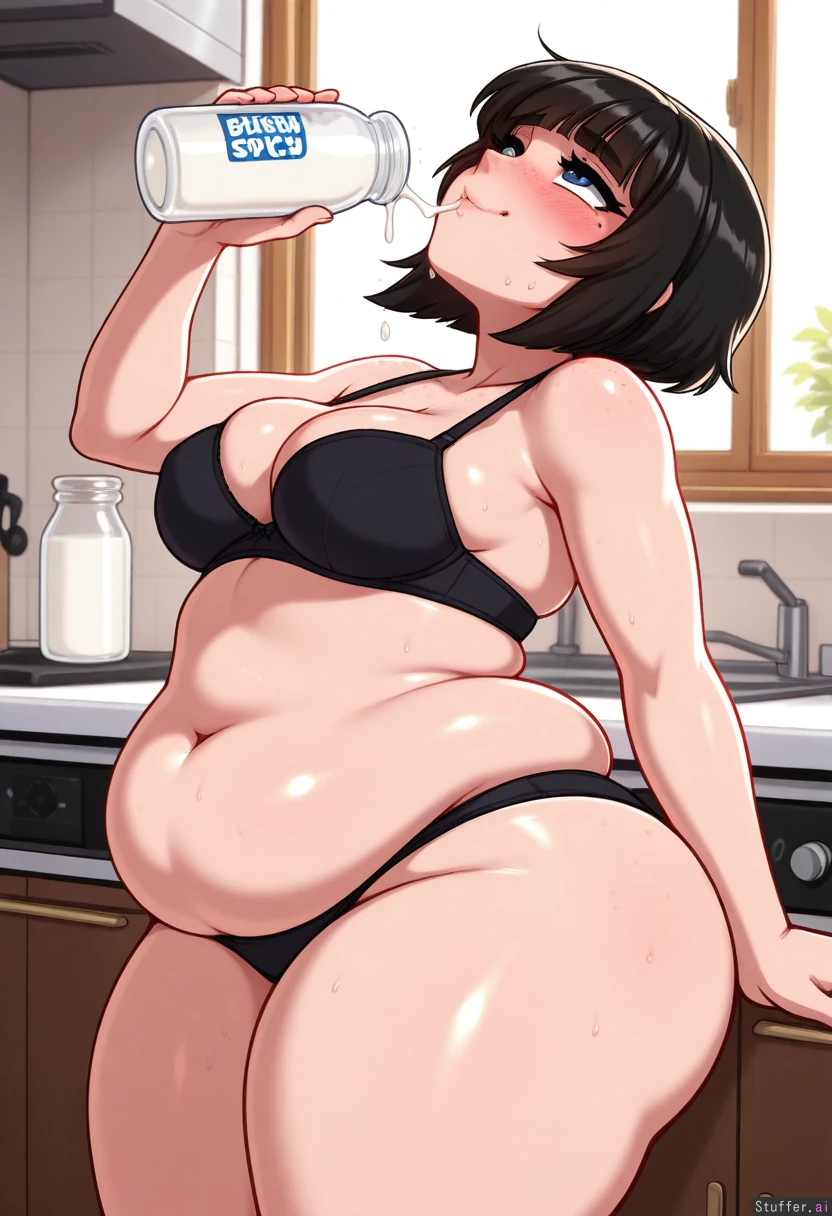 (((Morbidly obese))), ((((wide fat thighs)))), ((((wide fat hips)))), (medium breasts, perky breasts), (narrow waist), (highly detailed, best quality, masterpiece), (perfect anatomy, perfect proportions), (perfect lighting, warm lighting, vibrant colors, shadow, perfect shading), (beautiful face, beautiful eyes), (blushyspicy, merunyaa), (one girl, solo), (kitchen, window, golden hour lighting), (European girl, adult), (short black hair, inverted bob hair, blunt bangs, bangs over eyes), (blue eyes, narrow eyes, eyelashes, flared lashes), (brown skin, shiny skin, ((mole under eye, freckles, body freckles))), (fat lips), ((skindentation)), (black bra), (black panties), ((((blushing, sweating)))), (aroused, horny, heavy breathing), ((slight side view, standing, leaning back on kitchen counter, drinking huge milk bottle, holding milk bottle, milk dripping, head back, looking up))
