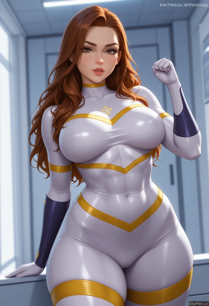 prywinko(artist), kittew(artist), best quality, high rating, photorealism, ultra realistic style, ultra realistic face, (Anissa (Invincible)), (super detailed, good shading) ((), horny, aroused, dominant, wide hips, (thick thighs), (big breasts:1.3), (Abs), Grey bodysuit,