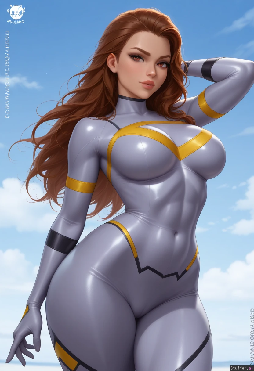 prywinko(artist), kittew(artist), best quality, high rating, photorealism, ultra realistic style, ultra realistic face, (Anissa (Invincible)), (super detailed, good shading) ((), horny, aroused, dominant, wide hips, (thick thighs), (big breasts:1.3), (Abs), Grey bodysuit,