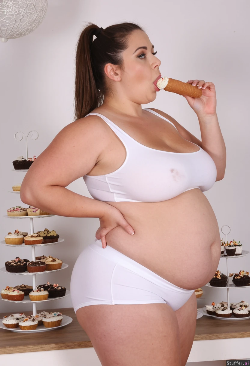 Beautiful brunette in very tight white sports shorts. Two hundred and thirty pounds in weight. Greedily Eating huge cakes . Painfully bloated. Im Getting very full, very stuffed and swollen flabby round belly is sticking right out and very bloated, slight stretch marks. surrounded by cakes ((front profile view)). Belly is totally stuffed solid with food. ((Looking at the camera )).