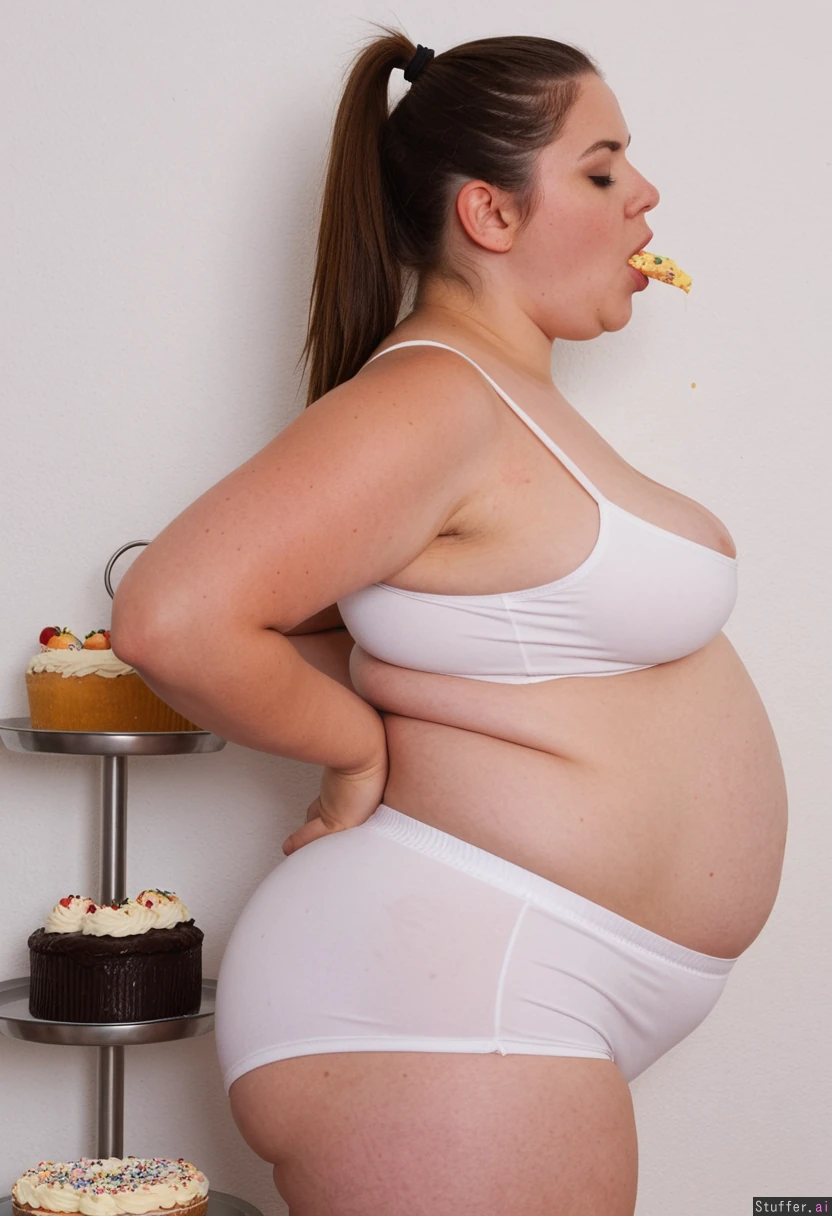 Beautiful fat brunette in very small skin tight white sports shorts. Three hundred pounds in weight. Painfully stuffed. Greedily Eating huge cakes . Painfully bloated. Im Getting very full, very stuffed and swollen flabby round belly is sticking right out and very bloated, slight stretch marks. surrounded by cakes ((back profile view)). Belly is totally stuffed solid with food. ((Looking at the camera )).