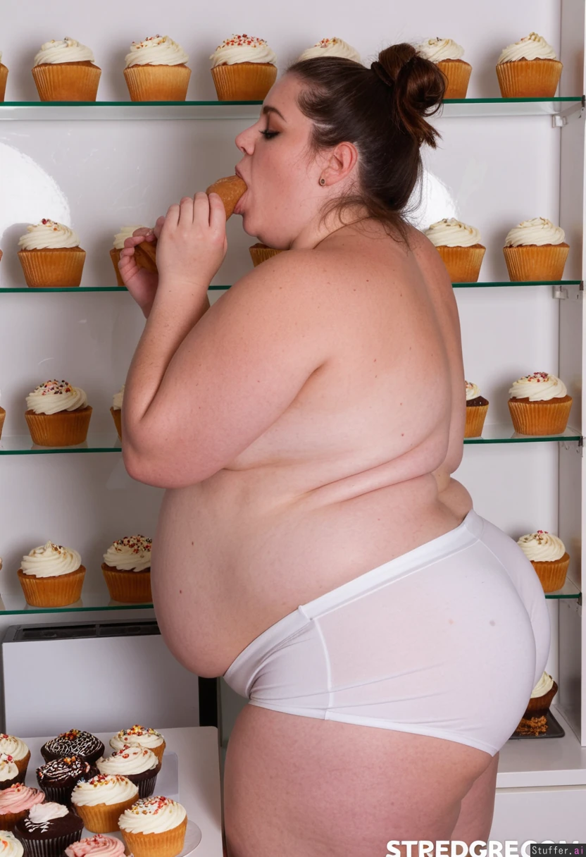 Beautiful fat Bbw brunette in very small skin tight white sports shorts. Three hundred pounds in weight. Painfully stuffed. Greedily Eating huge cakes . Painfully bloated. Im Getting very full, very stuffed and swollen flabby round belly is sticking right out and very bloated, slight stretch marks. surrounded by cakes ((back profile view)). Belly is totally stuffed solid with food. ((Looking at the camera )).