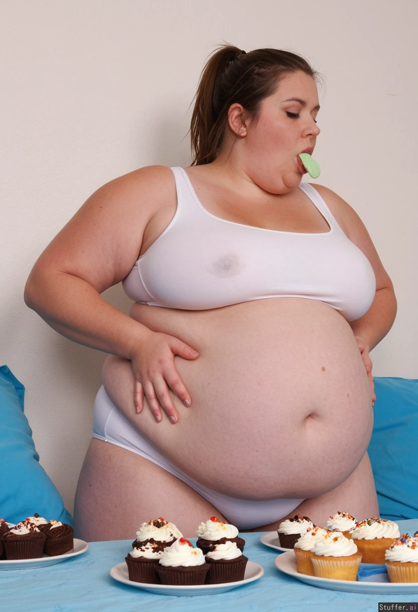Beautiful fat Bbw brunette in very small skin tight white sports shorts. Three hundred and twenty pounds in weight. Painfully stuffed. Greedily Eating huge cakes . Painfully bloated. Im Getting very full, very stuffed and swollen flabby round belly is sticking right out and very bloated, slight stretch marks. surrounded by cakes ((front profile view)). Belly is totally stuffed solid with food. ((Looking at the camera )).