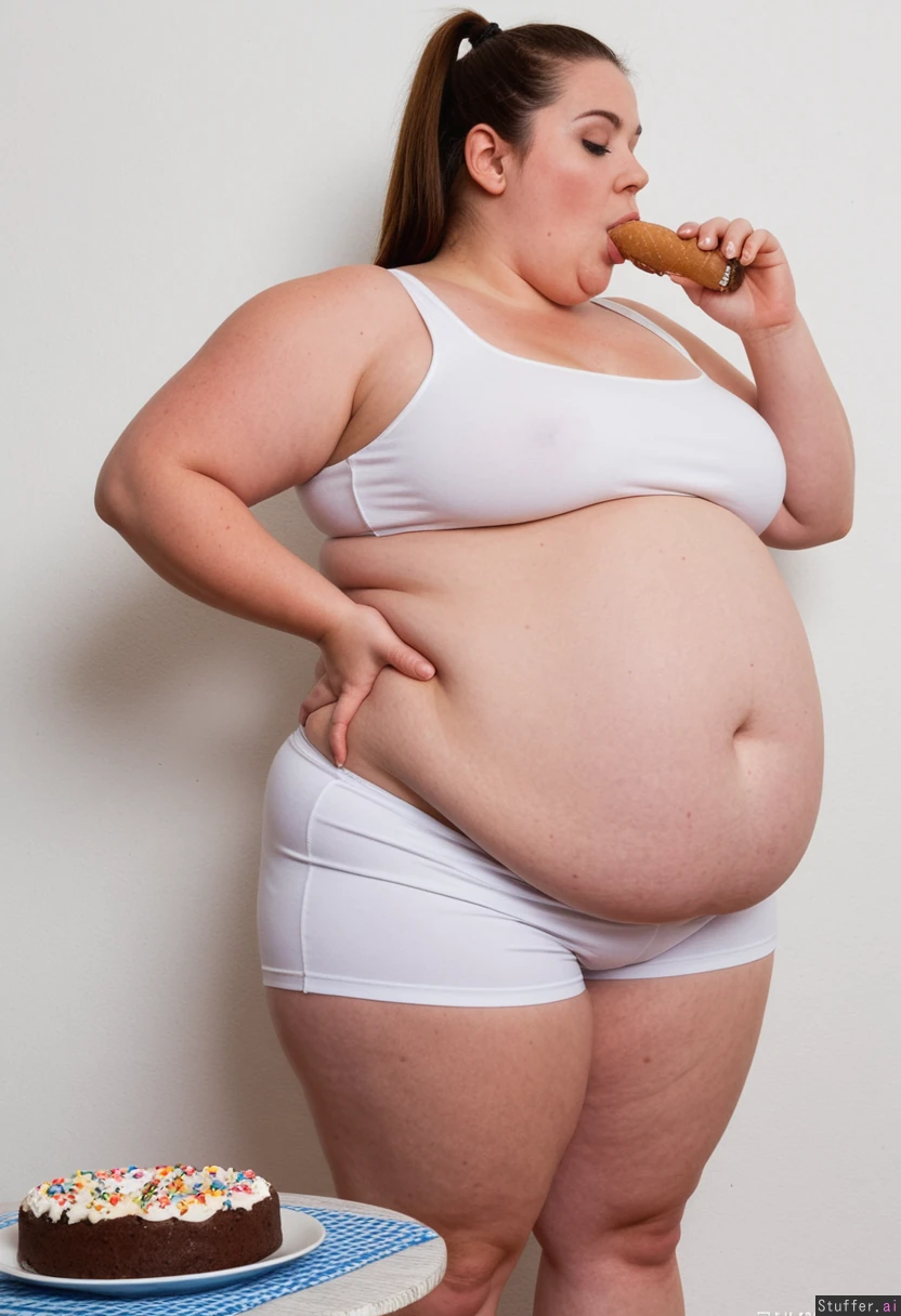 Beautiful fat SSBbw brunette in very small skin tight white sports shorts. ((Three hundred and forty pounds in weight)). Painfully stuffed. Greedily Eating huge cakes . Painfully bloated. Im Getting very full, very stuffed and swollen flabby round belly is sticking right out and very bloated, slight stretch marks. surrounded by cakes ((front profile view)). Belly is totally stuffed solid with food. ((Looking at the camera )).