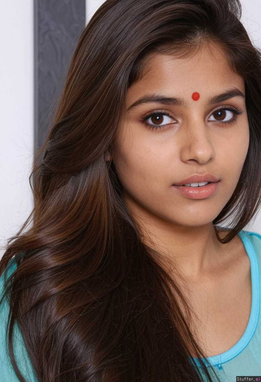 attractive influencer face, perfect model face, layered silky brown hair, 25 year old indian woman,