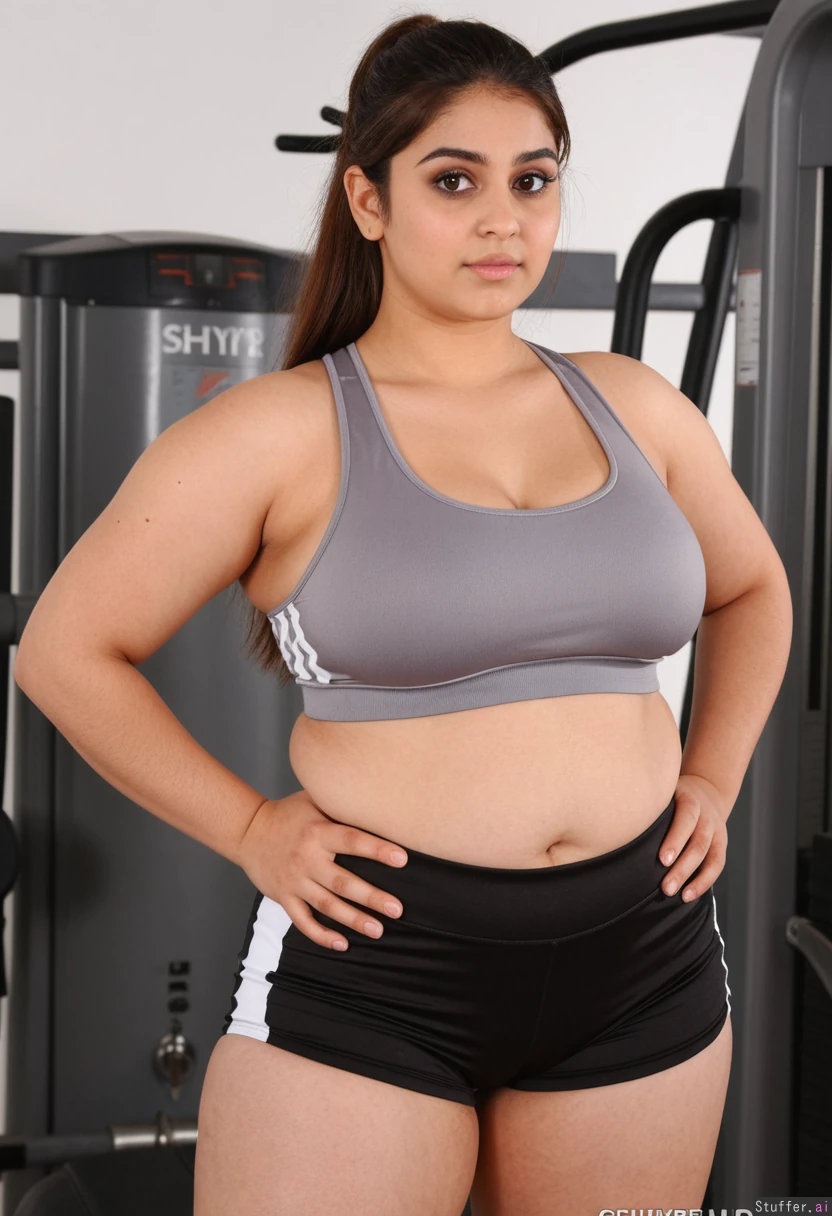 ((attractive feminine face, large brown eyes), perfect model face, layered silky brown hair, 25 year old indian woman), long brown hair, ((grey sports bra, tight black shorts with white stripe)), ((gym setting)), standing, ((hands on hips, shy pose)), perfect hands, (((slightly chubby belly))), (((sexy large wide hips))), (slim arms),
