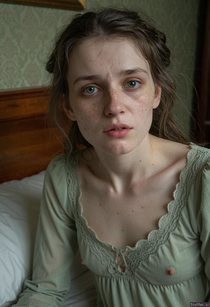 Masterpiece, best_quality, beautiful, cozy colors,(1girl), HDR, intricate detail, sophisticated detail, detailed textures, best lighting, full color, haptic style Hyper realistic, extremely sickly looking 28 year old european girl, , brunette-greyish e,messy hair,sick, smallpox 2.3, sewat, fever, victorian bedroom, dark green wallpaper, wooden frame bedroom, laying on the mattress, dull green eyes, skinny, pale green vicrorian nightgown, disfigured 3.2, lepres,leprosy scars 3.2, ghostly pale skin, , acne scars all over her face,crooked nose, greyish hair,messy hair,grey strands of hair+, deformed lips from leprosy, dull eyes from cataract wrinkly skin, missing an eye