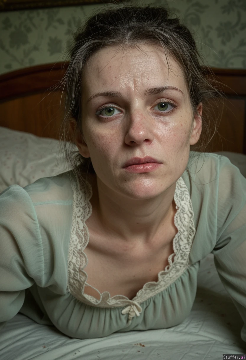 Masterpiece, best_quality, beautiful, cozy colors,(1girl), HDR, intricate detail, sophisticated detail, detailed textures, best lighting, full color, haptic style Hyper realistic, extremely sickly looking 40year old european girl, , brunette-greyish e,messy hair,sick, smallpox 2.3, sewat, fever, victorian bedroom, dark green wallpaper, wooden frame bedroom, laying on the mattress, dull green eyes, skinny, pale green vicrorian nightgown, disfigured 3.2, lepres,leprosy scars 3.2, ghostly pale skin, , acne scars all over her face,crooked nose, greyish hair,messy hair,grey strands of hair+, deformed lips from leprosy, dull eyes from cataract wrinkly skin, left eye missing, skin sagging under it