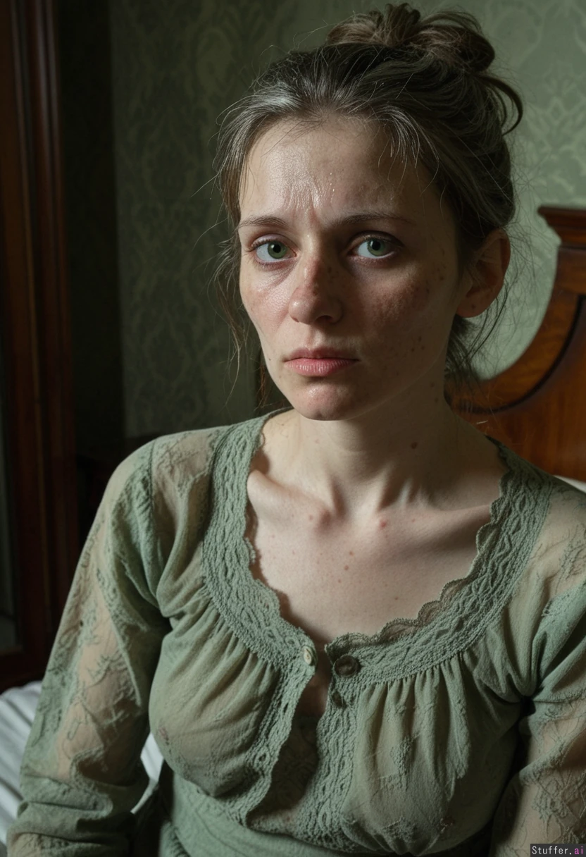 Masterpiece, best_quality, beautiful, cozy colors,(1girl), HDR, intricate detail, sophisticated detail, detailed textures, best lighting, full color, haptic style Hyper realistic, extremely sickly looking 40year old european girl, , brunette-greyish e,messy hair,sick, smallpox 2.3, sewat, fever, victorian bedroom, dark green wallpaper, wooden frame bedroom, laying on the mattress, dull green eyes, skinny, pale green vicrorian nightgown, disfigured 3.2, lepres,leprosy scars 3.2, ghostly pale skin, , acne scars all over her face,crooked nose, greyish hair,messy hair,grey strands of hair+, deformed lips from leprosy, dull eyes from cataract wrinkly skin, left eye missing, skin sagging under it, eyepatch covering her missing eye,pustules around her lips
