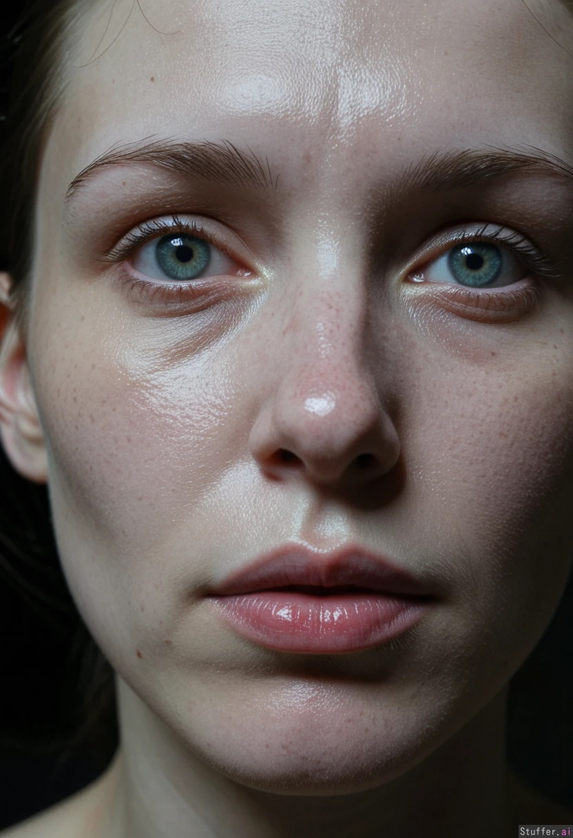 "Photorealistic close-up portrait of a young woman, extremely pale ashen skin with a sickly grayish-green undertone, gaunt and emaciated face, deeply sunken hollow cheeks, prominent sharp cheekbones, heavy dark purple-black circles under her eyes, sunken tired glassy eyes with red-rimmed lids, dull lifeless gaze, clammy translucent skin with visible blue veins on temples, subtle sheen of cold sweat on forehead, pale cracked lips with slight bluish tint, frail and chronically ill appearance, looks severely drained and unhealthy, desaturated colors, harsh cold lighting that emphasizes the shadows under her eyes and cheekbones, highly detailed skin texture with pores and imperfections, cinematic, 8k --stylize 250"