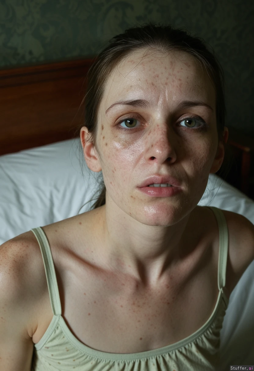 Hyper realistic of an extremely sickly and emaciated 28-year-old European woman, severely ill with advanced leprosy and smallpox scars, ghostly pale greenish skin with sagging wrinkled texture, multiple deep leprosy scars and disfigurement on face and body, pustules and open sores around deformed lips, acne scars everywhere, crooked deformed nose, dull cloudy cataract eyes with one eye completely missing and covered by a black eyepatch, skin heavily sagging under the missing eye, feverish sweaty sheen on skin, messy greyish-brown hair with many grey strands, very skinny frail body, (extreme sickly appearance:1.4), (horrifyingly diseased face:1.35), (leprosy disfigurement:1.4), (smallpox pockmarks:1.3) She is laying weakly on a mattress in a dark Victorian bedroom with peeling dark green wallpaper and wooden frame bed, wearing a pale green stained Victorian nightgown, dim moody lighting, gloomy atmosphere Masterpiece, best quality, hyper detailed textures, intricate skin details, realistic sweat and pores, cinematic lighting, full color, photorealistic waist up