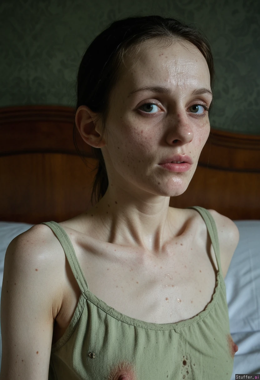 Hyper realistic of an extremely sickly and emaciated 28-year-old European woman, severely ill with advanced leprosy and smallpox scars, ghostly pale greenish skin with sagging wrinkled texture, multiple deep leprosy scars and disfigurement on face and body, pustules and open sores around deformed lips, acne scars everywhere, crooked deformed nose, dull cloudy cataract eyes with one eye completely missing and covered by a black eyepatch, skin heavily sagging under the missing eye, feverish sweaty sheen on skin, messy greyish-brown hair with many grey strands, very skinny frail body, (extreme sickly appearance:1.4), (horrifyingly diseased face:1.35), (leprosy disfigurement:1.4), (smallpox pockmarks:1.3) She is laying weakly on a mattress in a dark Victorian bedroom with peeling dark green wallpaper and wooden frame bed, wearing a pale green stained Victorian nightgown, dim moody lighting, gloomy atmosphere Masterpiece, best quality, hyper detailed textures, intricate skin details, realistic sweat and pores, cinematic lighting, full color, photorealistic ( waist up shot)
