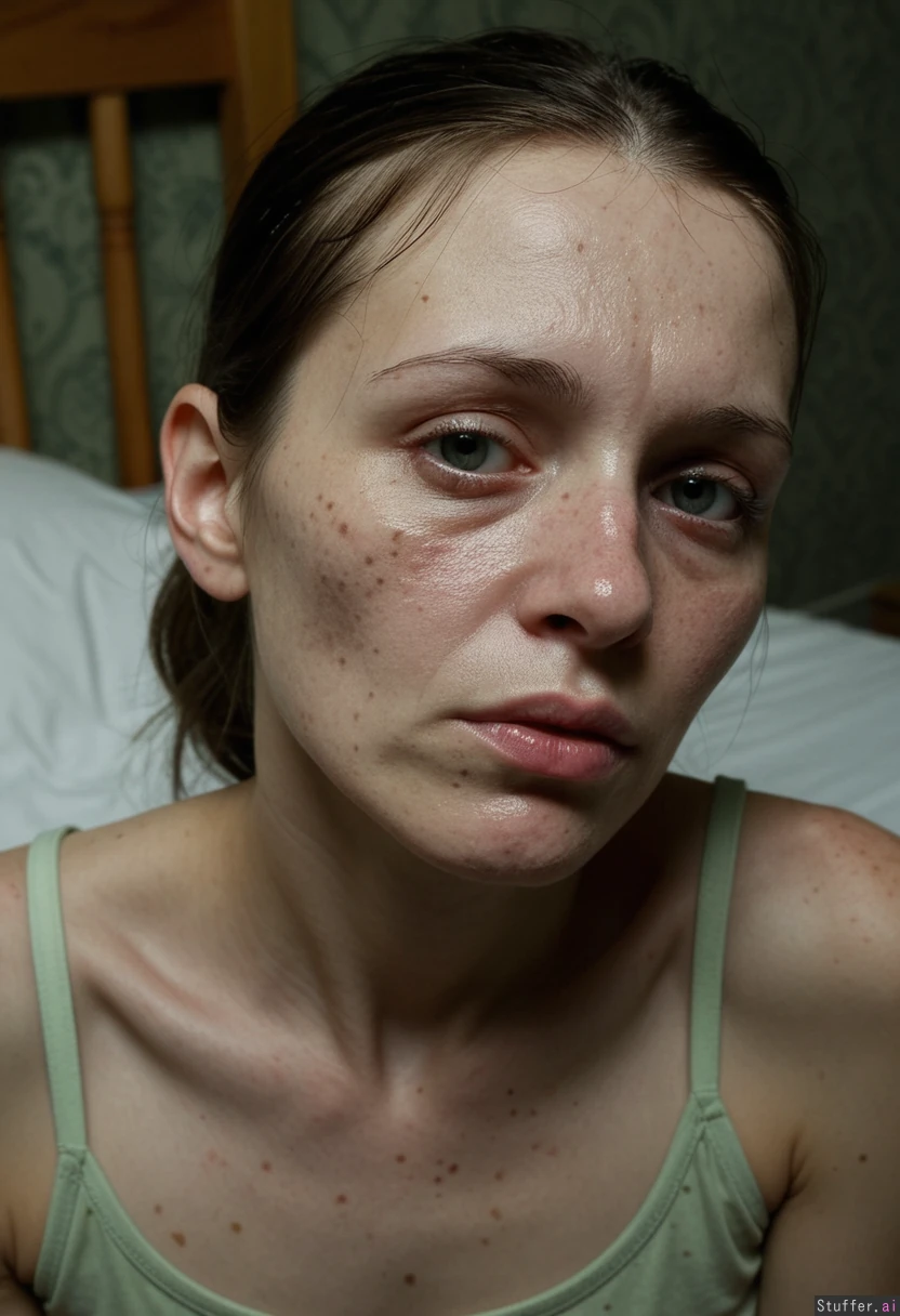 Hyper realistic of an extremely sickly and emaciated 28-year-old European woman, severely ill with advanced leprosy and smallpox scars, ghostly pale greenish skin with sagging wrinkled texture, multiple deep leprosy scars and disfigurement on face and body, pustules and open sores around deformed lips, acne scars everywhere, crooked deformed nose, dull cloudy cataract eyes with one eye completely missing and covered by a black eyepatch, skin heavily sagging under the missing eye, feverish sweaty sheen on skin, messy greyish-brown hair with many grey strands, very skinny frail body, (extreme sickly appearance:1.4), (horrifyingly diseased face:1.35), (leprosy disfigurement:1.4), (smallpox pockmarks:1.3) She is laying weakly on a mattress in a dark Victorian bedroom with peeling dark green wallpaper and wooden frame bed, wearing a pale green stained Victorian nightgown, dim moody lighting, gloomy atmosphere Masterpiece, best quality, hyper detailed textures, intricate skin details, realistic sweat and pores, cinematic lighting, full color, photorealistic ( waist up shot)