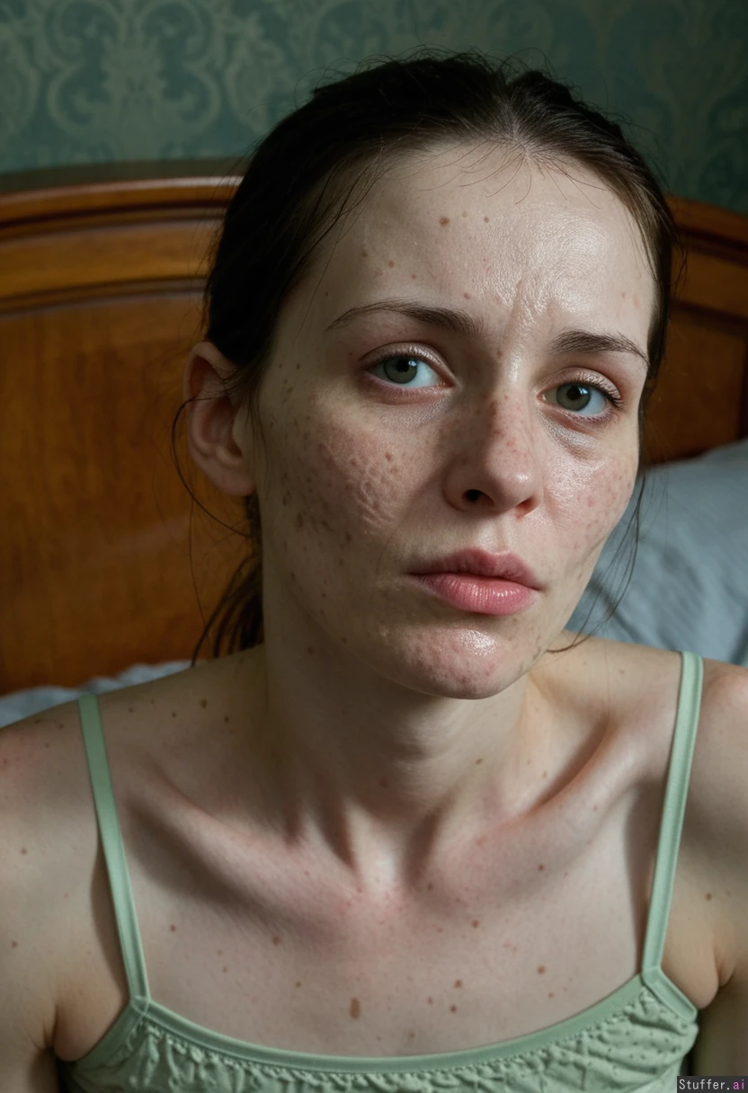 Hyper realistic of an extremely sickly and emaciated 28-year-old European woman, severely ill with advanced leprosy and smallpox scars, ghostly pale greenish skin with sagging wrinkled texture, multiple deep leprosy scars and disfigurement on face and body, pustules and open sores around deformed lips, acne scars everywhere, crooked deformed nose, dull cloudy cataract eyes with one eye completely missing and covered by a black eyepatch, skin heavily sagging under the missing eye, feverish sweaty sheen on skin, messy greyish-brown hair with many grey strands, very skinny frail body, (extreme sickly appearance:1.4), (horrifyingly diseased face:1.35), (leprosy disfigurement:1.4), (smallpox pockmarks:1.3) She is laying weakly on a mattress in a dark Victorian bedroom with peeling dark green wallpaper and wooden frame bed, wearing a pale green stained Victorian nightgown, dim moody lighting, gloomy atmosphere Masterpiece, best quality, hyper detailed textures, intricate skin details, realistic sweat and pores, cinematic lighting, full color, photorealistic ( waist up shot)