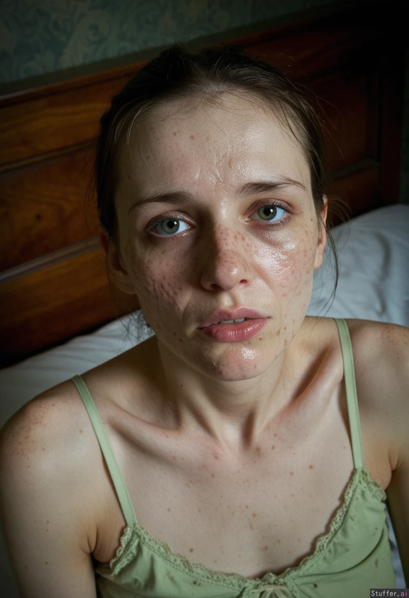 Hyper realistic of an extremely sickly and emaciated 28-year-old European woman, severely ill with advanced leprosy and smallpox scars, ghostly pale greenish skin with sagging wrinkled texture, multiple deep leprosy scars and disfigurement on face and body, pustules and open sores around deformed lips, acne scars everywhere, crooked deformed nose, dull cloudy cataract eyes with one eye completely missing and covered by a black eyepatch, skin heavily sagging under the missing eye, feverish sweaty sheen on skin, messy greyish-brown hair with many grey strands, very skinny frail body, (extreme sickly appearance:1.4), (horrifyingly diseased face:1.35), (leprosy disfigurement:1.4), (smallpox pockmarks:1.3),victorian green nightgown, She is laying weakly on a mattress in a dark Victorian bedroom with peeling dark green wallpaper and wooden frame bed, wearing a pale green stained Victorian nightgown, dim moody lighting, gloomy atmosphere Masterpiece, best quality, hyper detailed textures, intricate skin details, realistic sweat and pores, cinematic lighting, full color, photorealistic ( waist up shot)