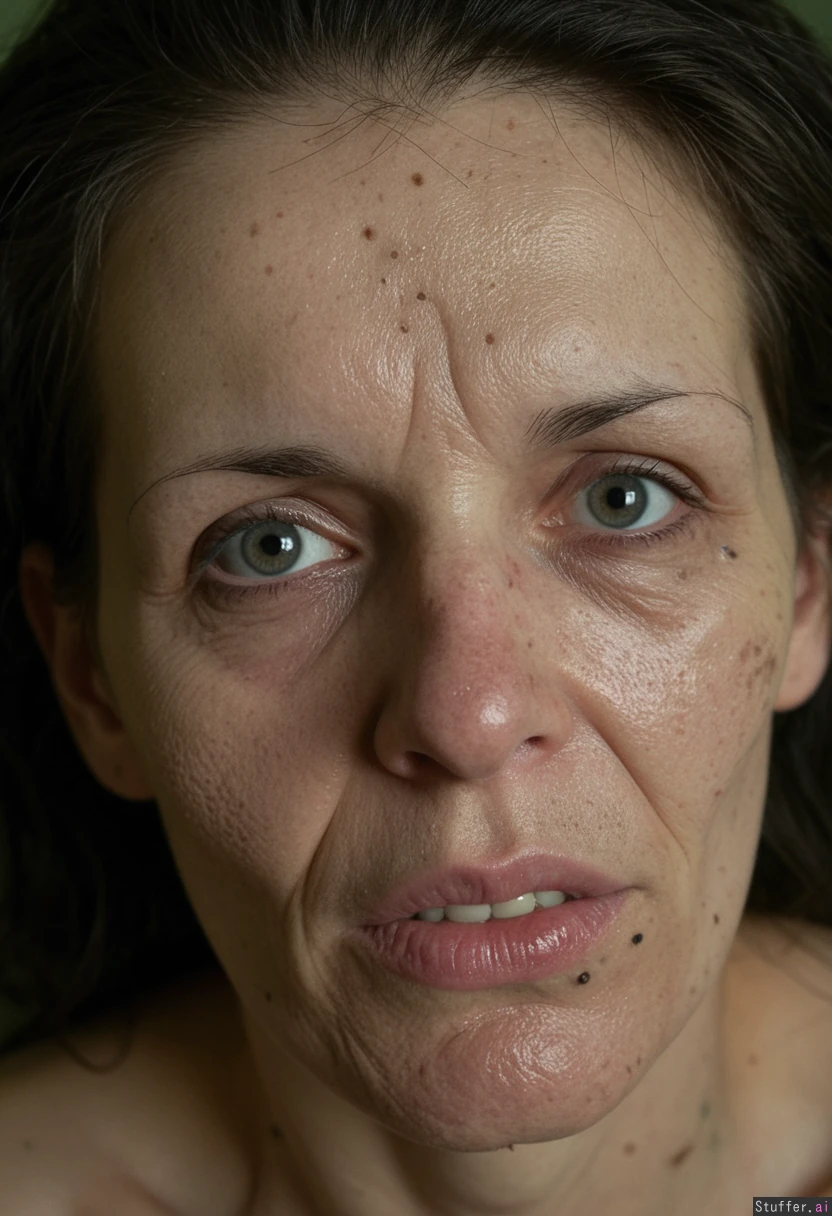 hotorealistic extreme close-up of a horrifyingly diseased 40 year old woman dying of leprosy and smallpox, face completely ravaged, deep pitted scars, pus-filled pustules around cracked deformed lips, one eye missing with sagging empty socket partially covered by dirty eyepatch, cloudy dull grey cataract eye, greyish messy sweaty hair, ghostly pale sallow skin with green undertones, extreme emaciation and wrinkles, fever sweat, (grotesque disfigured face:1.6), (advanced leprosy scars and deformities:1.5), laying exhausted in Victorian bed with dark green wallpaper
