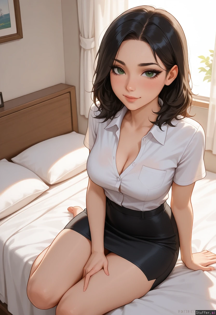 solo, best quality, high quality, full body, detailed face, detailed eyes, kittew(artist), 1 adult woman, 25 years old, (medium messy black hair, green eyes, black eyeliner), (short-sleeved white collared blouse, black pencil skirt), (top button open, buttons strain very tight, cleavage, button gaps), (slight smile), bedroom, sitting on the bed, (day) (average body, small round tight breasts), (tight blouse, tight skirt),