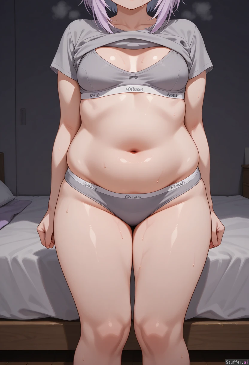 solo , nekomata_okayu , side_view , head_out_of_frame , standing , gray_shirt , gray_bra , dark_bedroom , sweat , heavy_breathing , small_breasts, legs , belly , chubby ,