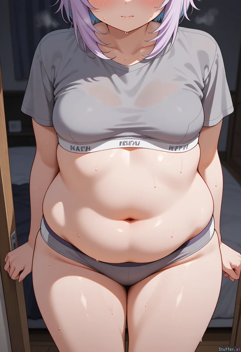 solo , nekomata_okayu , front_view , head_out_of_frame , standing , gray_shirt , gray_bra , dark_bedroom , sweat , heavy_breathing , small_breasts, legs , belly , fat ,
