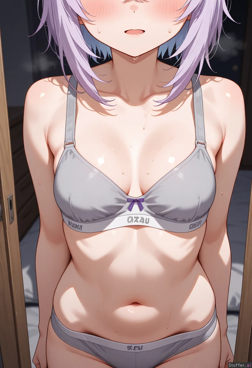 solo , nekomata_okayu , straight_on , head_out_of_frame , standing , gray_underwear , gray_bra , dark_bedroom , sweat , heavy_breathing , legs , belly , small_breasts ,