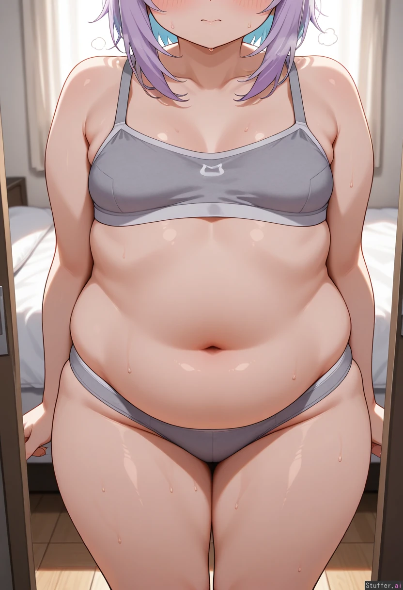 solo , nekomata_okayu , straight_on:1.2 , head_out_of_frame , standing , gray_underwear , gray_bra , dark_bedroom , sweat , heavy_breathing , obese , legs , belly , small_breasts ,