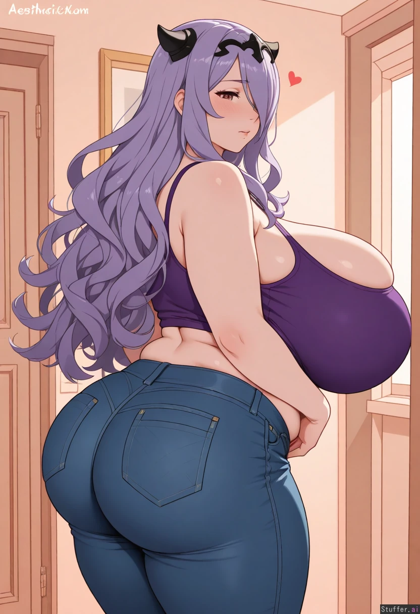 Aesthetically pleasing, High quality, (Masterpiece), (warm colors), (semi-realistic human anatomy), (flat colors:1.3), 1girl, (Camilla from fire emblem fates), blushing, Purple crop top, jeans, (huge hyper breasts), breasts, huge ass, chunky, thick thighs, swollen, body inflation, In a pink apartment, fat rolls, swollen_body, swollen_breasts,