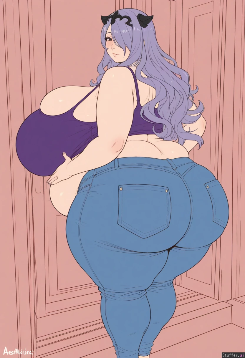 Aesthetically pleasing, High quality, (Masterpiece), (warm colors), (semi-realistic human anatomy), (flat colors:1.3), 1girl, (Camilla from fire emblem fates), blushing, Purple crop top, jeans, (gigantic hyper breasts), breasts, (Huge round belly), huge ass, chunky, thick thighs, bloated, body expansion, swollen, body inflation, from_front, from_above, In a pink apartment, fat rolls, swollen_body, swollen_breasts,