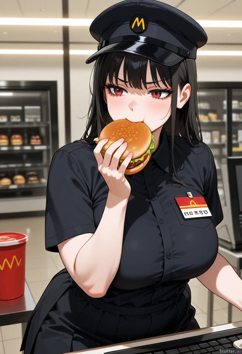1girl, masterpiece, medium_breasts, (undersized black McDonalds fast_food_uniform, uniform getting tighter as she gains weight), (her breasts are growing and her body is getting pudgy from gaining weight), employee, bangs, black_hair, red eyes, solo, mascara, eyelashes, goth, annoyed. (she's ashamed that she's fattening up working at McDonalds). (she is addicted to burgers. She is eating a burger.) Fat, chubby_female, fat_arms
