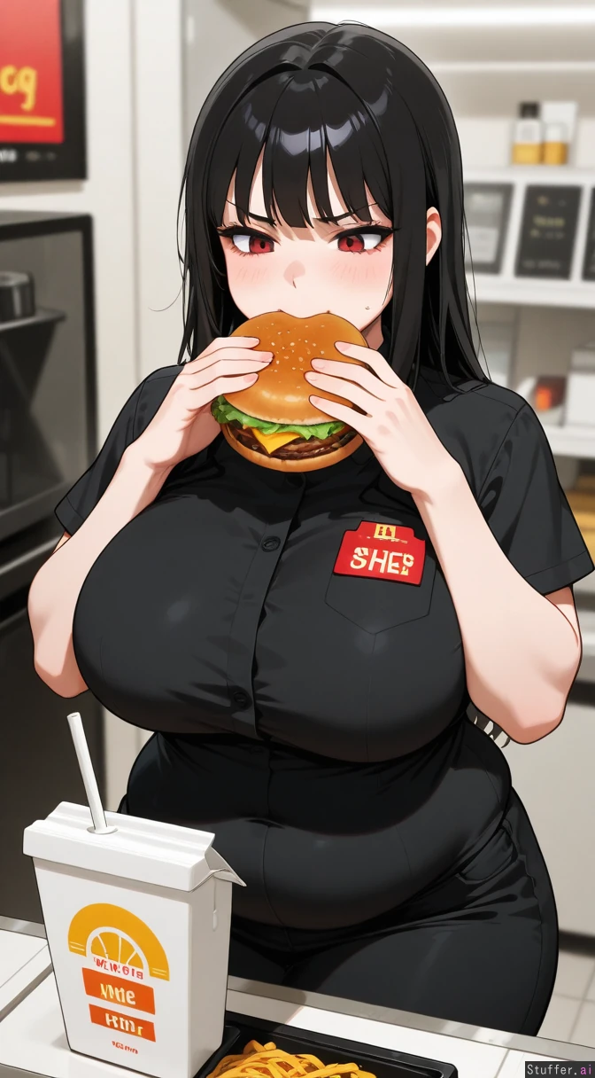 1girl, masterpiece, medium_breasts, (undersized black McDonalds fast_food_uniform, uniform getting tighter as she gains weight), (her breasts are growing and her body is getting pudgy from gaining weight), employee, bangs, black_hair, red eyes, solo, mascara, eyelashes, goth, annoyed. (she's ashamed that she's fattening up working at McDonalds). (she is addicted to burgers. She is eating a burger.) Fat, chubby_female, fat_arms, fat_fingers, chubby curvy, fat,