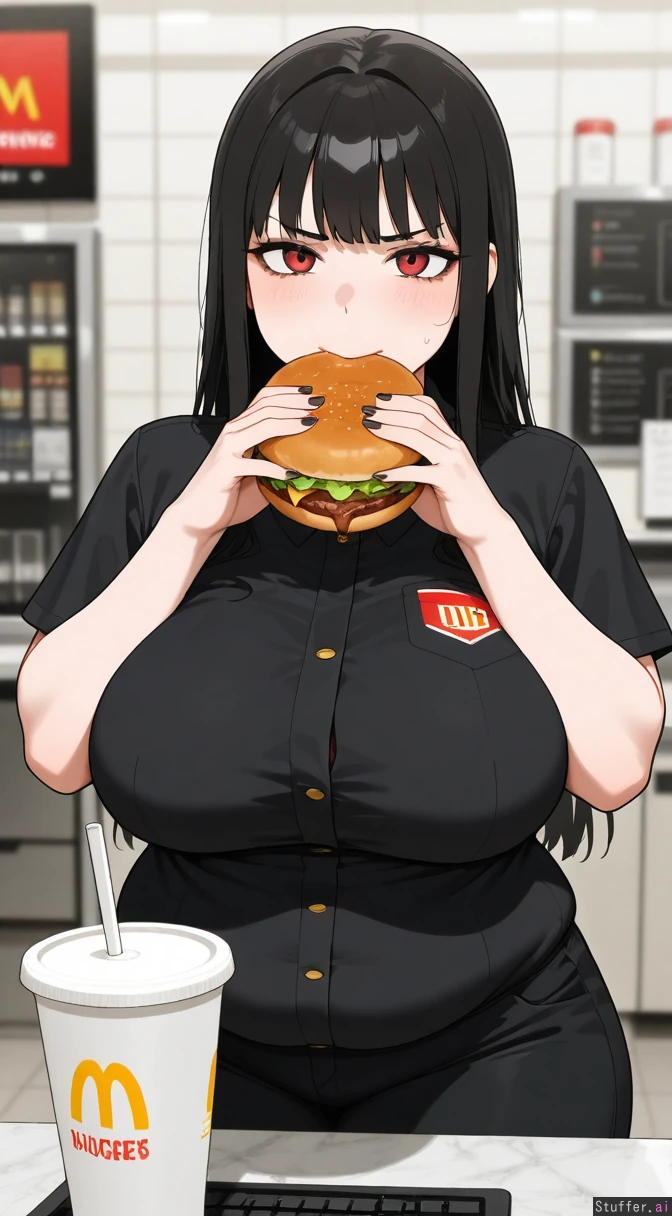 1girl, masterpiece, medium_breasts, (undersized black McDonalds fast_food_uniform, uniform getting tighter as she gains weight), (her breasts are growing and her body is getting pudgy from gaining weight), employee, bangs, black_hair, red eyes, solo, mascara, eyelashes, goth, annoyed. (she's ashamed that she's fattening up working at McDonalds). (she is addicted to burgers. She is eating a burger.) Fat, chubby_female, fat_arms, fat_fingers, chubby curvy, fat, fatter button_gap