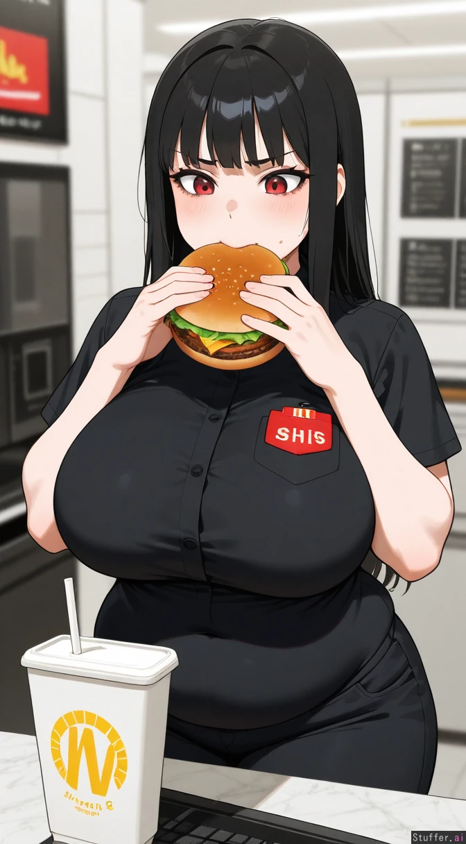 1girl, masterpiece, medium_breasts, (undersized black McDonalds fast_food_uniform, uniform getting tighter as she gains weight), (her breasts are growing and her body is getting pudgy from gaining weight), employee, bangs, black_hair, red eyes, solo, mascara, eyelashes, goth, annoyed. (she's ashamed that she's fattening up working at McDonalds). (she is addicted to burgers. She is eating a burger.) Fat, chubby_female, fat_arms, fat_fingers, chubby curvy, fat, fatter unbutton, chubby_cheeks