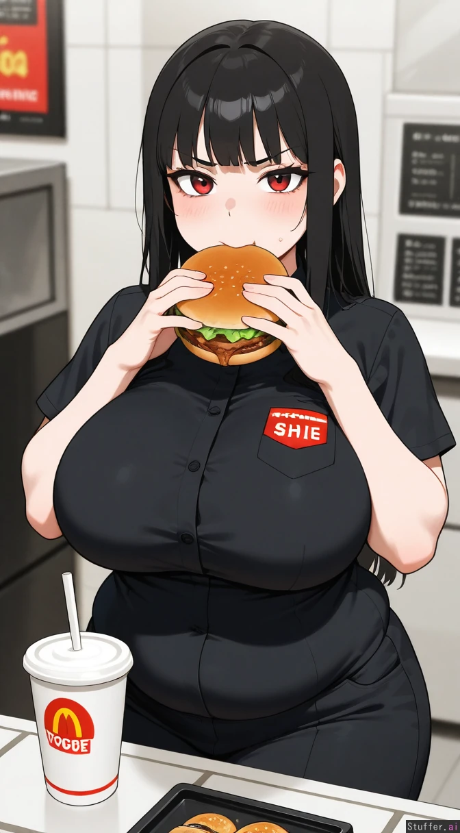 1girl, masterpiece, medium_breasts, (undersized black McDonalds fast_food_uniform, uniform getting tighter as she gains weight), (her breasts are growing and her body is getting pudgy from gaining weight), employee, bangs, black_hair, red eyes, solo, mascara, eyelashes, goth, annoyed. (she's ashamed that she's fattening up working at McDonalds). (she is addicted to burgers. She is eating a burger.) Fat, chubby_female, fat_arms, fat_fingers, chubby curvy, fat, fatter unbutton, chubby_cheeks together uniform