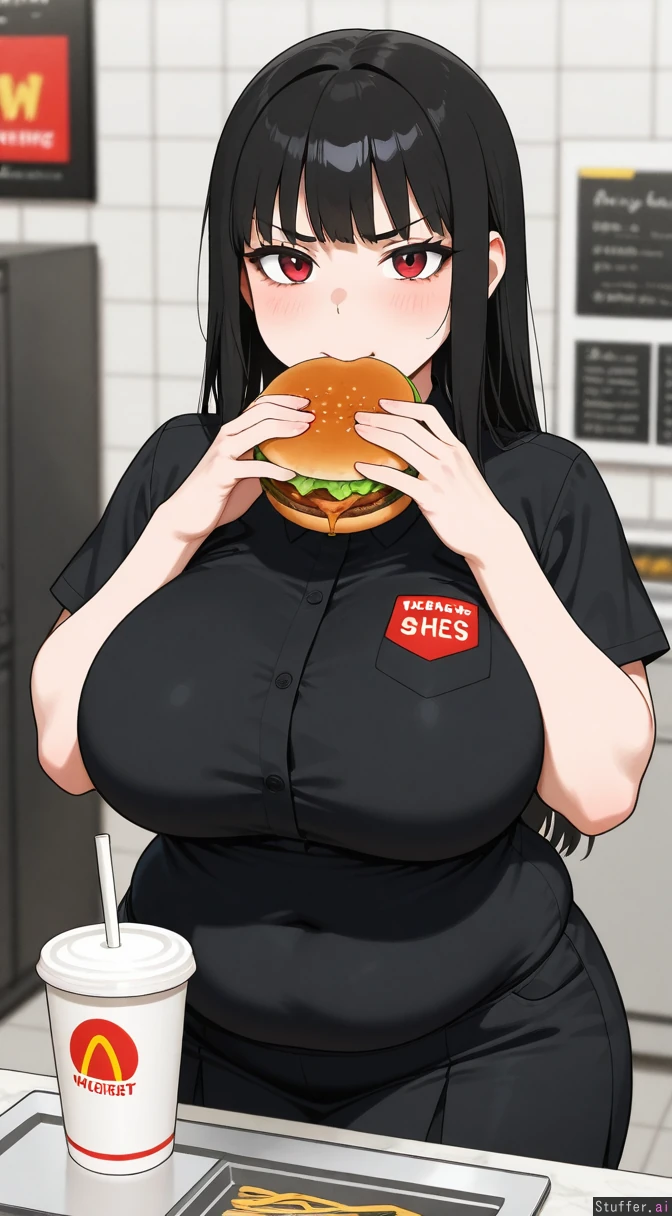 1girl, masterpiece, medium_breasts, (undersized black McDonalds fast_food_uniform, uniform getting tighter as she gains weight), (her breasts are growing and her body is getting pudgy from gaining weight), employee, bangs, black_hair, red eyes, solo, mascara, eyelashes, goth, annoyed. (she's ashamed that she's fattening up working at McDonalds). (she is addicted to burgers. She is eating a burger.) Fat, chubby_female, fat_arms, fat_fingers, chubby curvy, fat, fatter unbutton, chubby_cheeks together uniform pudgy