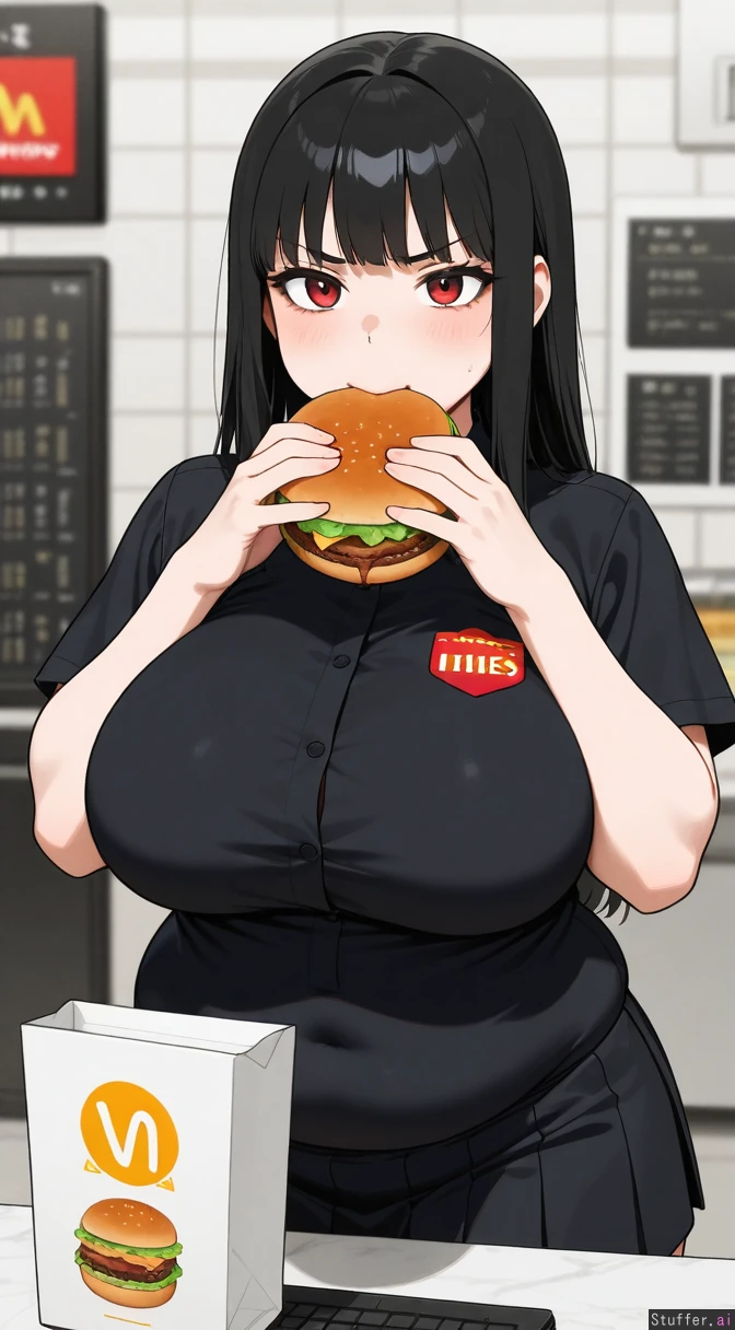 1girl, masterpiece, medium_breasts, (undersized black McDonalds fast_food_uniform, uniform getting tighter as she gains weight), (her breasts are growing and her body is getting pudgy from gaining weight), employee, bangs, black_hair, red eyes, solo, mascara, eyelashes, goth, annoyed. (she's ashamed that she's fattening up working at McDonalds). (she is addicted to burgers. She is eating a burger.) Fat, chubby_female, fat_arms, fat_fingers, chubby curvy, fat, fatter unbutton, chubby_cheeks tigther uniform, pudgy,