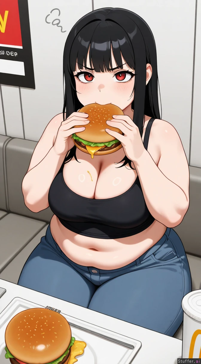1girl, masterpiece, medium_breasts, (undersized black tanktop, pjamas pants, uniform getting tighter as she gains weight), (her breasts are growing and her body is getting pudgy from gaining weight), employee, bangs, black_hair, red eyes, solo, mascara, eyelashes, goth, annoyed. (she's ashamed that she's fattening up working at McDonalds). (she is addicted to burgers. She is eating a burger.) Fat, chubby_female, fat_arms, fat_fingers, chubby curvy, fat, fatter unbutton, chubby_cheeks tigther uniform, pudgy, in pjamas, barefeet on table,