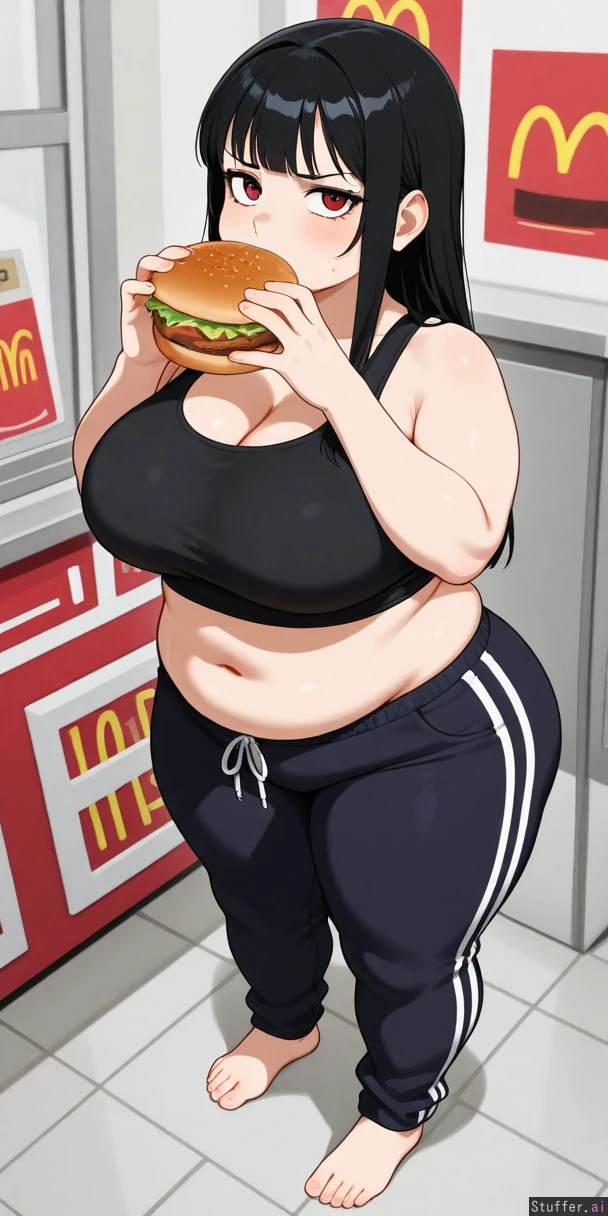 1girl, masterpiece, medium_breasts, (undersized black tanktop, pjamas pants, uniform getting tighter as she gains weight), (her breasts are growing and her body is getting pudgy from gaining weight), employee, bangs, black_hair, red eyes, solo, mascara, eyelashes, goth, annoyed. (she's ashamed that she's fattening up working at McDonalds). (she is addicted to burgers. She is eating a burger.) Fat, chubby_female, fat_arms, fat_fingers, chubby curvy, fat, fatter unbutton, chubby_cheeks tigther uniform, pudgy, in pjamas, barefoot, naked