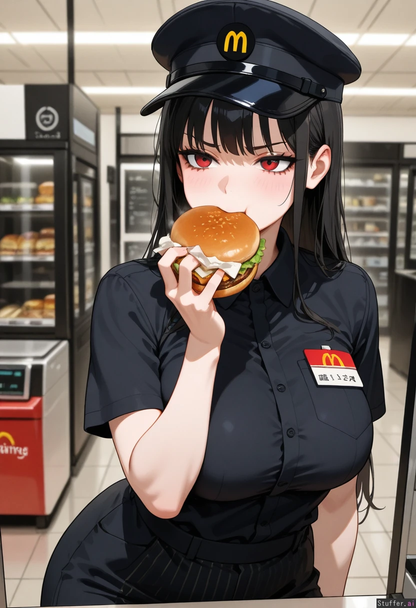 1girl, masterpiece, medium_breasts, (undersized black McDonalds fast_food_uniform, uniform getting tighter as she gains weight), (her breasts are growing and her body is getting pudgy from gaining weight), employee, bangs, black_hair, red eyes, solo, mascara, eyelashes, goth, annoyed. (she's ashamed that she's fattening up working at McDonalds). (she is addicted to burgers. She is eating a burger.) Fat,