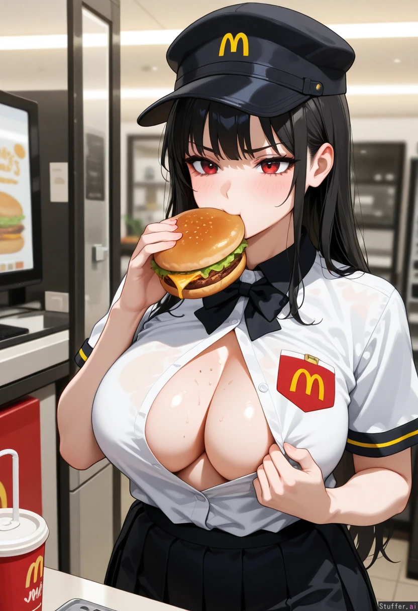 1girl, masterpiece, medium_breasts, (undersized black McDonalds fast_food_uniform, uniform getting tighter as she gains weight), (her breasts are growing and her body is getting pudgy from gaining weight), employee, bangs, black_hair, red eyes, solo, mascara, eyelashes, goth, annoyed. (she's ashamed that she's fattening up working at McDonalds). (she is addicted to burgers. She is eating a burger.) Fat, unbuttoned_shirt on chest, chubby,