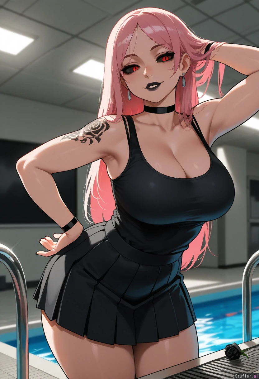 solo, masterpiece, amazing resolution, nyantcha(artist), krekkov(artist), dramatic lighting, intricate details, detailed eyes, hdr, best quality, (soft shading), dim lighting, realistic lighting, Standing at pool side, teasing (tilting head sideways, leaning forward, unbalanced pose, hand on hip, hand on hair, sexy), looking upwards at viewer, viewer looking at her, 1woman, (((Takako Uro from Jujustsu Kaisen))), ((goth mommy)), long hair, falling past her shoulders toward her mid-back, slightly layered and natural hair, parted near middle, no bangs, natural straight_hair, flirty, light pink hair with light pink highlights, black lipstick, dark eye shadow and eye liner, wide hips, (thick thighs:1.1), full breasts, (chubby belly:0.1), tummy pooch, legs together, relaxed, sweet, nave, flushed, ((chubby:0.3)), slim figure, (fatass:1.2), (Eyes: black sclera, black iris, white round pupil), Silver earrings, black bracelets with gold accented fasteners, black choker, (no mask), (no tail), (top tucked into bottoms), red and black rose tattoos on arms, (Top: fitted tank top, black top, fabric is tight and slightly wrinkled, clinging to her torso and emphasizing a streamlined shape, scoop neckline, simple and casual, tank top straps: Instead of normal tank top straps, there are thicker, more industrial straps bonded with the top that go over her shoulders, secured with small fasteners), (Bottoms: loose, polyester, low-waisted pleated short skirt in a blaack tone, the skirt is baggy and relaxed, theres visible gathering at the waist, showing elastic or drawstring fit), Pool side, inside,