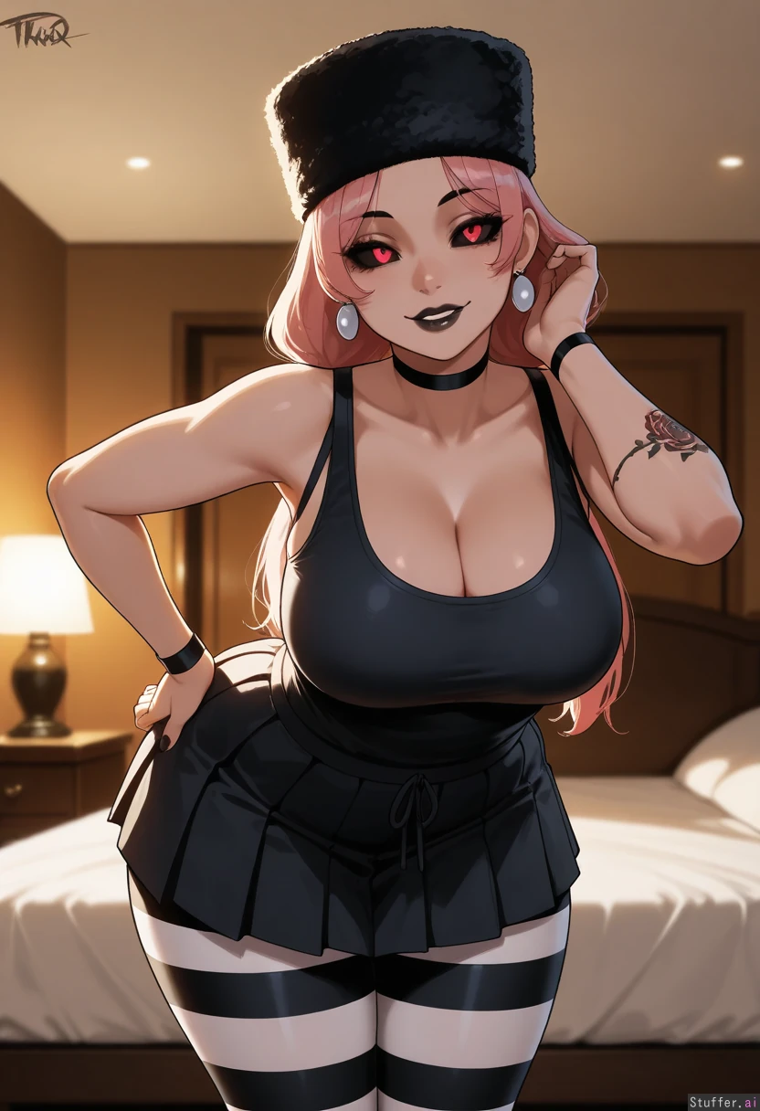 solo, masterpiece, amazing resolution, nyantcha(artist), krekkov(artist), dramatic lighting, intricate details, detailed eyes, hdr, best quality, (soft shading), dim lighting, realistic lighting, Standing next to bed, teasing (tilting head sideways, leaning forward, unbalanced pose, hand on hip, hand on hair, sexy), looking upwards at viewer, viewer looking at her, 1woman, (((Takako Uro from Jujustsu Kaisen))), ((goth mommy)), long hair, falling past her shoulders toward her mid-back, slightly layered and natural hair, parted near middle, low pigtails, no bangs, natural straight_hair, flirty, light pink hair with light pink highlights, black lipstick, dark eye shadow and eye liner, wide hips, (thick thighs:1.1), full breasts, (chubby belly:0.1), tummy pooch, legs together, relaxed, sweet, nave, flushed, ((chubby:0.3)), chubby figure, (fatass:1.2), (Eyes: black sclera, black iris, white round pupil), (Accessories: Silver earrings, black bracelets with gold accented fasteners, black choker, black Russian fur hat, white and black striped thigh-high leggings), (no mask), (no tail), (top tucked into bottoms), red and black rose tattoos on arms, (Top: fitted tank top, black top, fabric is tight and slightly wrinkled, clinging to her torso and emphasizing a streamlined shape, scoop neckline, simple and casual, tank top straps: Instead of normal tank top straps, there are thicker, more industrial straps bonded with the top that go over her shoulders, secured with small fasteners), (Bottoms: loose, polyester, low-waisted pleated short skirt in a blaack tone, the skirt is baggy and relaxed, theres visible gathering at the waist, showing elastic or drawstring fit), Hotel bedroom, inside,