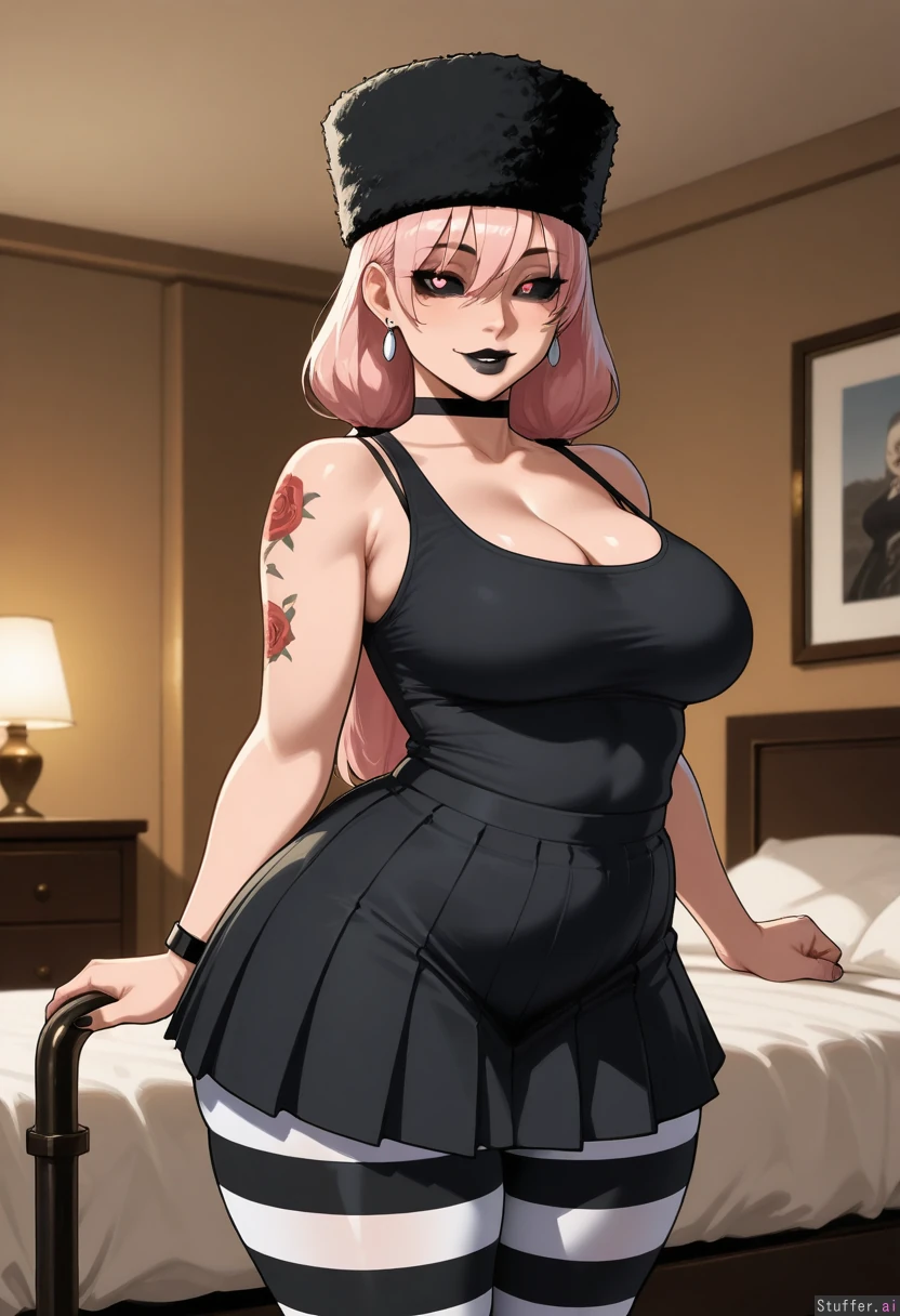 solo, masterpiece, amazing resolution, nyantcha(artist), krekkov(artist), dramatic lighting, intricate details, detailed eyes, hdr, best quality, (soft shading), dim lighting, realistic lighting, Standing next to bed, teasing (tilting head sideways, unbalanced pose, sexy pose), looking upwards at viewer, viewer looking at her, 1woman, (((Takako Uro from Jujustsu Kaisen))), ((goth mommy)), long hair, falling past her shoulders toward her mid-back, slightly layered and natural hair, parted near middle, low pigtails, no bangs, natural straight_hair, flirty, light pink hair with light pink highlights, black lipstick, dark eye shadow and eye liner, wide hips, (thick thighs:1.2), full breasts, (fat belly:0.9), tummy pooch, legs together, relaxed, sweet, nave, flushed, ((chubby:1.1)), chubby figure, (fatass:1.3), (Eyes: black sclera, black iris, white round pupil), (Accessories: Silver earrings, black bracelets with gold accented fasteners, black choker, black Russian fur hat, white and black striped knee-high leggings), (no mask), (no tail), (top tucked into bottoms), red and black rose tattoos on arms, (Top: fitted tank top, black top, fabric is tight and slightly wrinkled, clinging to her torso and emphasizing a streamlined shape, scoop neckline, simple and casual, tank top straps: Instead of normal tank top straps, there are thicker, more industrial straps bonded with the top that go over her shoulders, secured with small fasteners), (Bottoms: loose, polyester, low-waisted pleated short skirt in a blaack tone, the skirt is baggy and relaxed, theres visible gathering at the waist, showing elastic or drawstring fit), Hotel bedroom, inside,