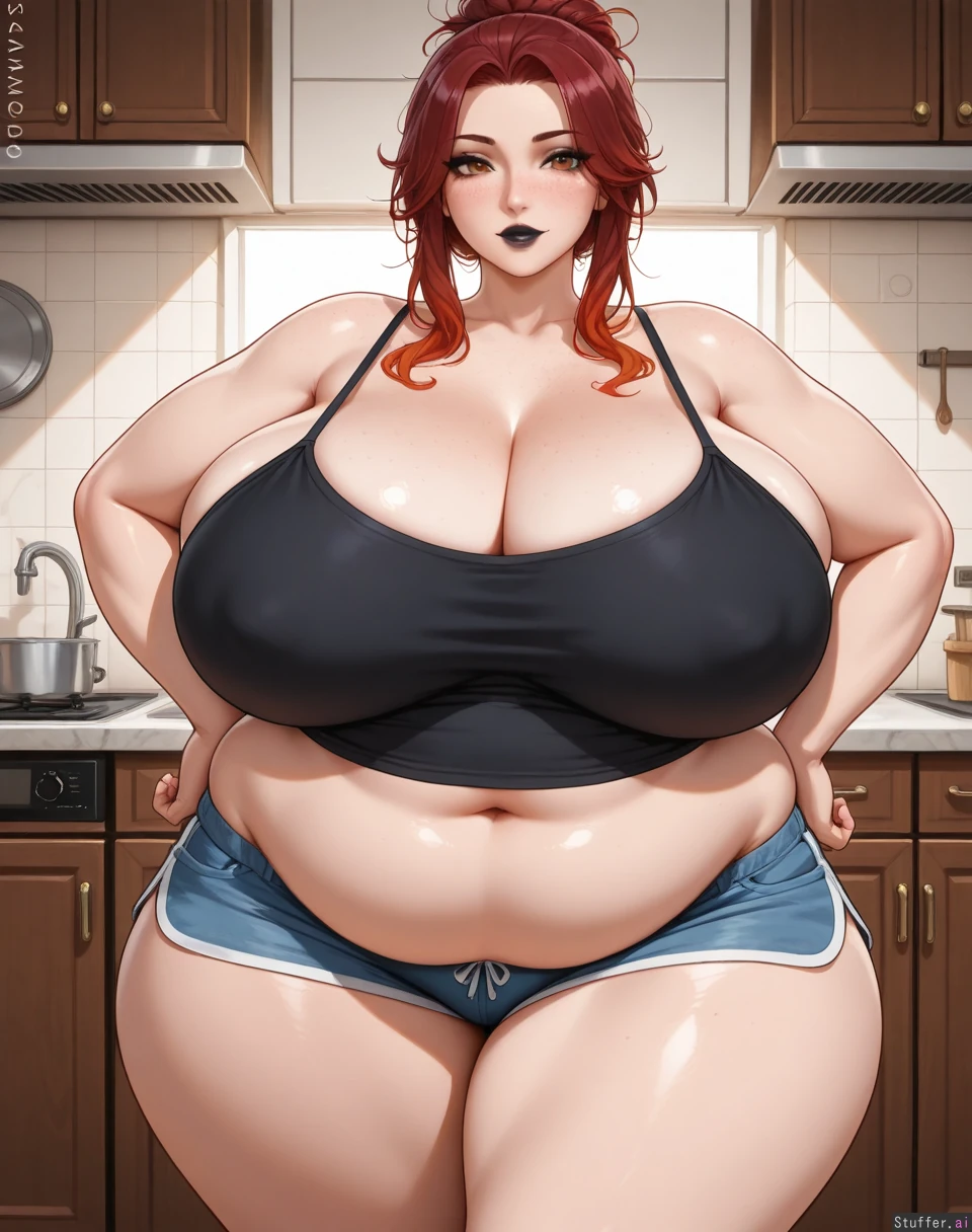 (((masterpiece, best quality, 8K resolution, focus on details, best quality possible, sharp image, gorgeus, beautiful, highres, vibrant colors, crisp lines, extremely detailed face))), soft lighting, 1girl, solo, (detailed skin, realistic skin texture, freckles), knot hairstyle, tidy hair, dark red hair, amber highlights, messy hair, amber eyes, black lipstick, Kittew(artist), sciamano240(artist), (((extremely curvy, absurdly voluptuous, very obese, absurdly thick body))), (gigantic breasts, sagging breasts, pendulous breasts), (obese pelvis, huge fupa, huge belly flab), ((defined waist)), (fat flabs), ((absurdly massive hips, broad hips, bottom heavy)), ((extremely thick thighs, extremely fat legs)), ((chubby face, fat arms)), black camisole, shorts, black lipstick, standing, kitchen, morning