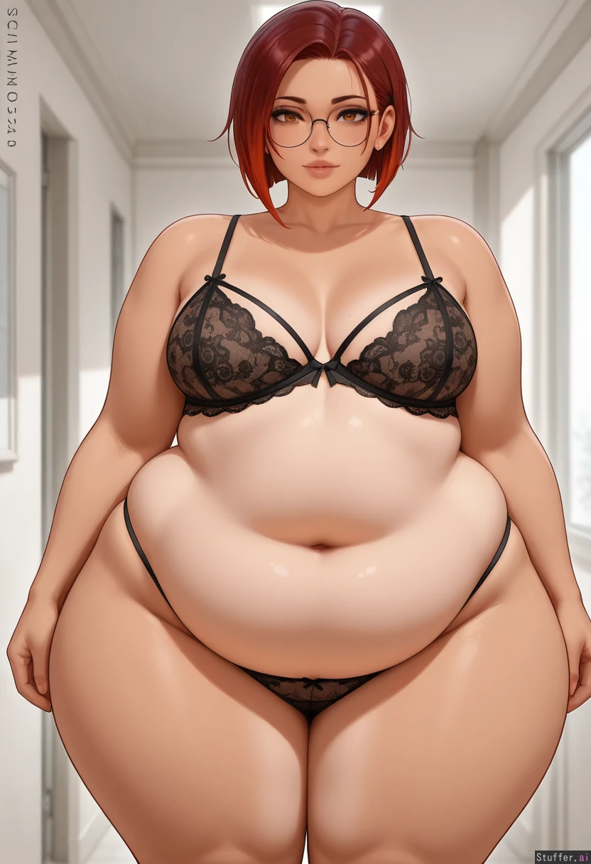 sciamano240(artist), kittew(artist), (obese:1.1), (chubby belly, saggy belly:1.5), (fat legs:1.8), (wide hips:1.8), amber_eyes' human, perfect human anatomy, medium breasts, (fat arms:1.1), looking_at_viewer, brown skin, dark red hair, amber highlights, round_glasses, wolfcut, lingerie, detailed face,
