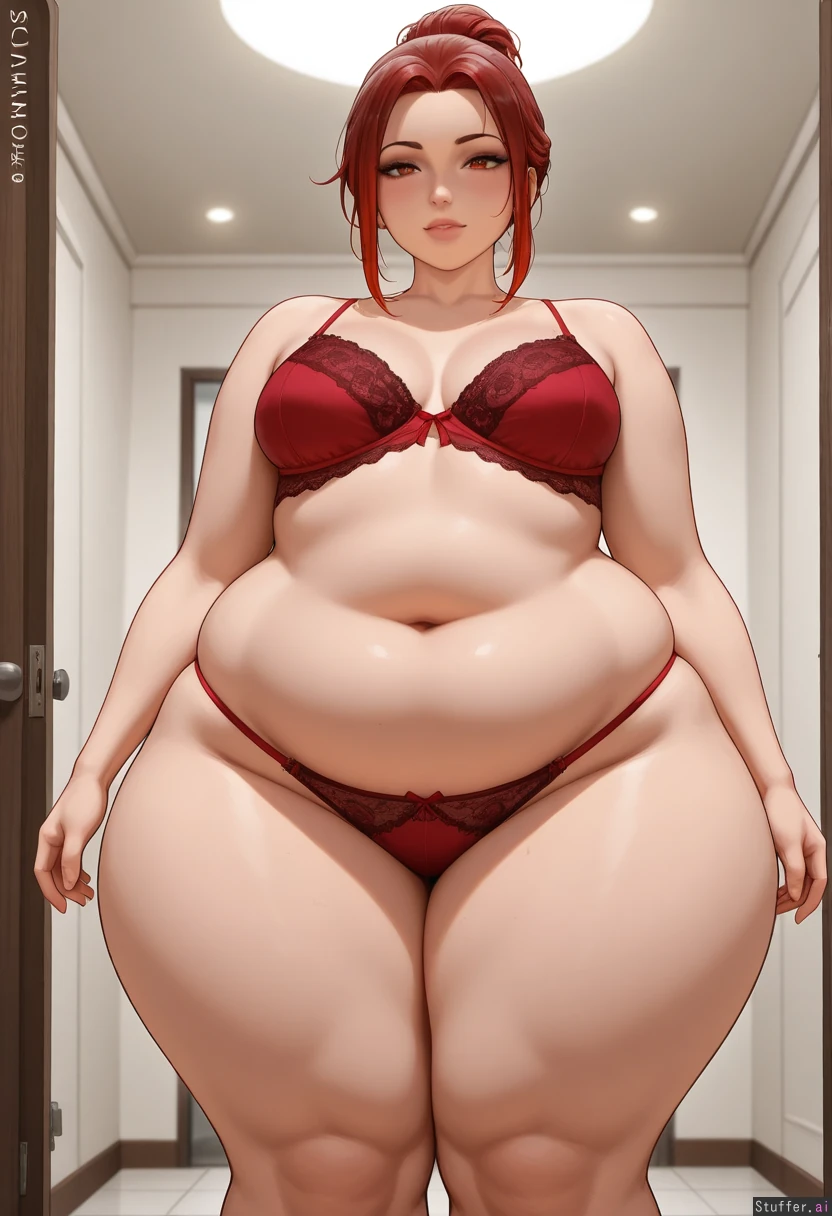 sciamano240(artist), kittew(artist), (obese:1.1), (chubby belly, saggy belly:1.5), (fat legs:1.8), (wide hips:1.8), amber_eyes' human, perfect human anatomy, medium breasts, (fat arms:1.1), looking_at_viewer, brown skin, dark red hair, amber highlights, high knot hairstyle, lingerie, detailed face,