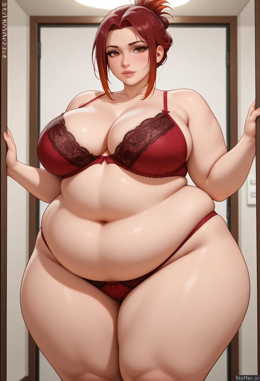 sciamano240(artist), kittew(artist), (obese:1.2), (chubby belly, saggy belly:1.5), (fat legs:1.8), (wide hips:1.8), amber_eyes' human, perfect human anatomy, huge breasts, (fat arms:1.1), looking_at_viewer, brown skin, dark red hair, amber highlights, high knot hairstyle, lingerie, detailed face,