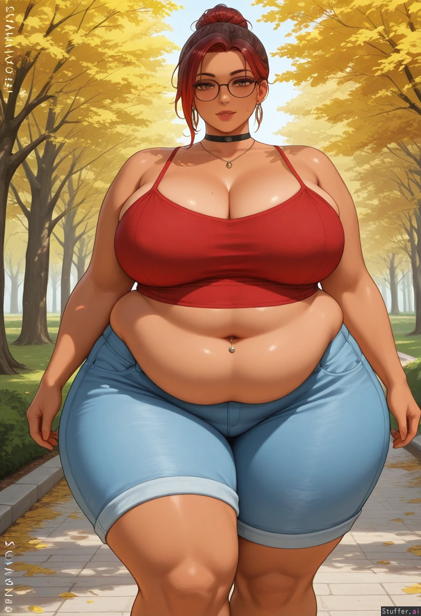 sciamano240(artist), kittew(artist), (obese:1.2), (chubby belly, saggy belly:1.5), (fat legs:1.8), (wide hips:1.8), amber_eyes' human, perfect human anatomy, gigantic breasts, (fat arms, brown skin:1.1), looking_at_viewer, dark red hair, amber highlights, high knot hairstyle, navel piercing, choker, necklace, earrings, oval glasses, red camisole, high waisted jeans, detailed face, walking, park