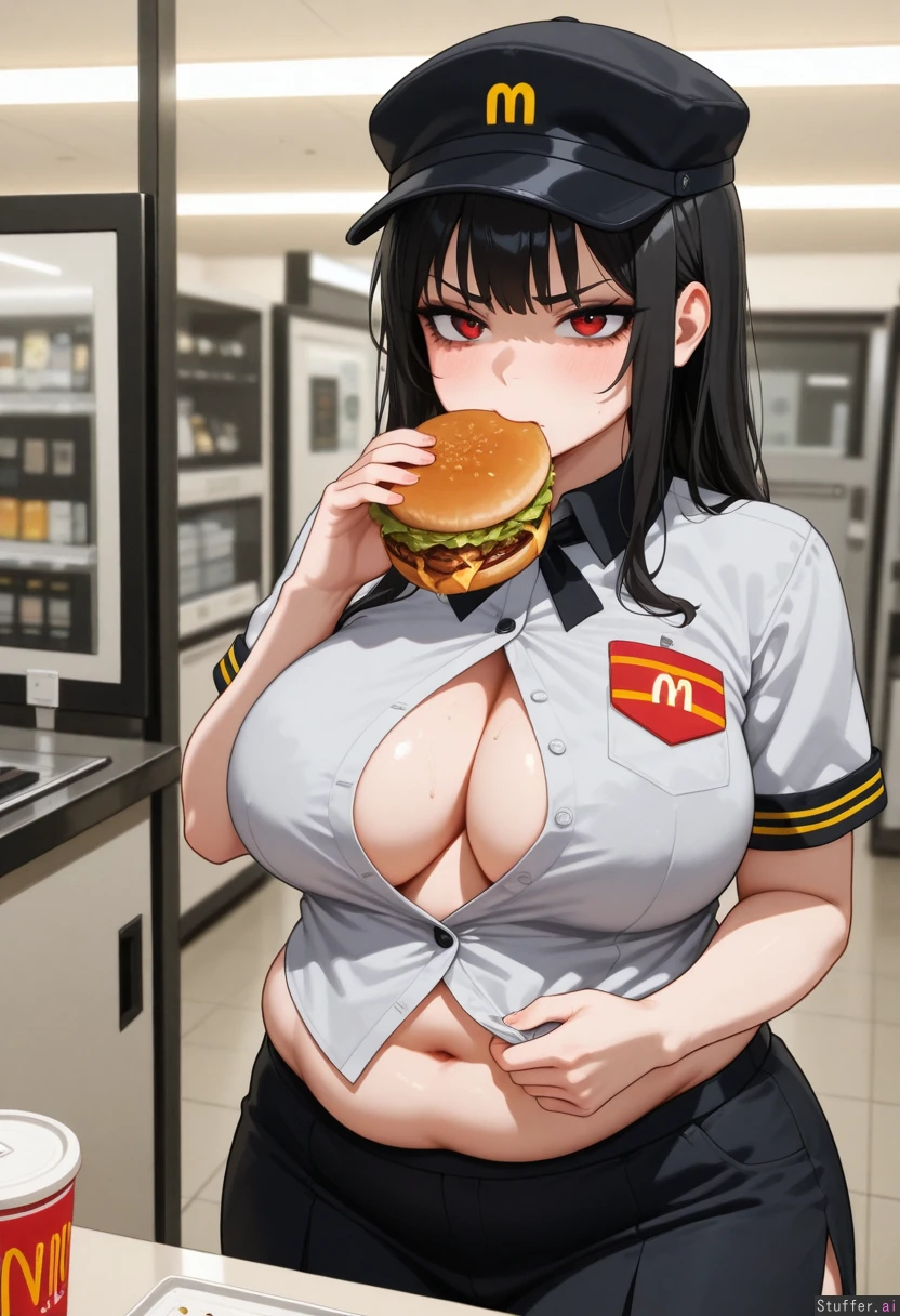 1girl, masterpiece, medium_breasts, (undersized black McDonalds fast_food_uniform, uniform getting tighter as she gains weight), (her breasts are growing and her body is getting pudgy from gaining weight), employee, bangs, black_hair, red eyes, solo, mascara, eyelashes, goth, annoyed. (she's ashamed that she's fattening up working at McDonalds). (she is addicted to burgers. She is eating a burger.) Fat, unbuttoned_shirt on chest, chubby, fatass, fat_arms, obease, fat_hips, fat_belly, chubby,