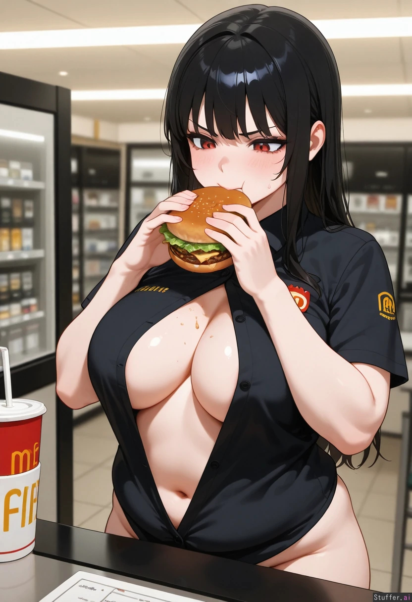 1girl, masterpiece, medium_breasts, (undersized black McDonalds fast_food_uniform, uniform getting tighter as she gains weight), (her breasts are growing and her body is getting pudgy from gaining weight), employee, bangs, black_hair, red eyes, solo, mascara, eyelashes, goth, annoyed. (she's ashamed that she's fattening up working at McDonalds). (she is addicted to burgers. She is eating a burger.) Fat, unbuttoned_shirt on chest, chubby, fatass, fat_arms, obease, fat_hips, fat_belly, chubby, chubby_female, chubby_arms naked,